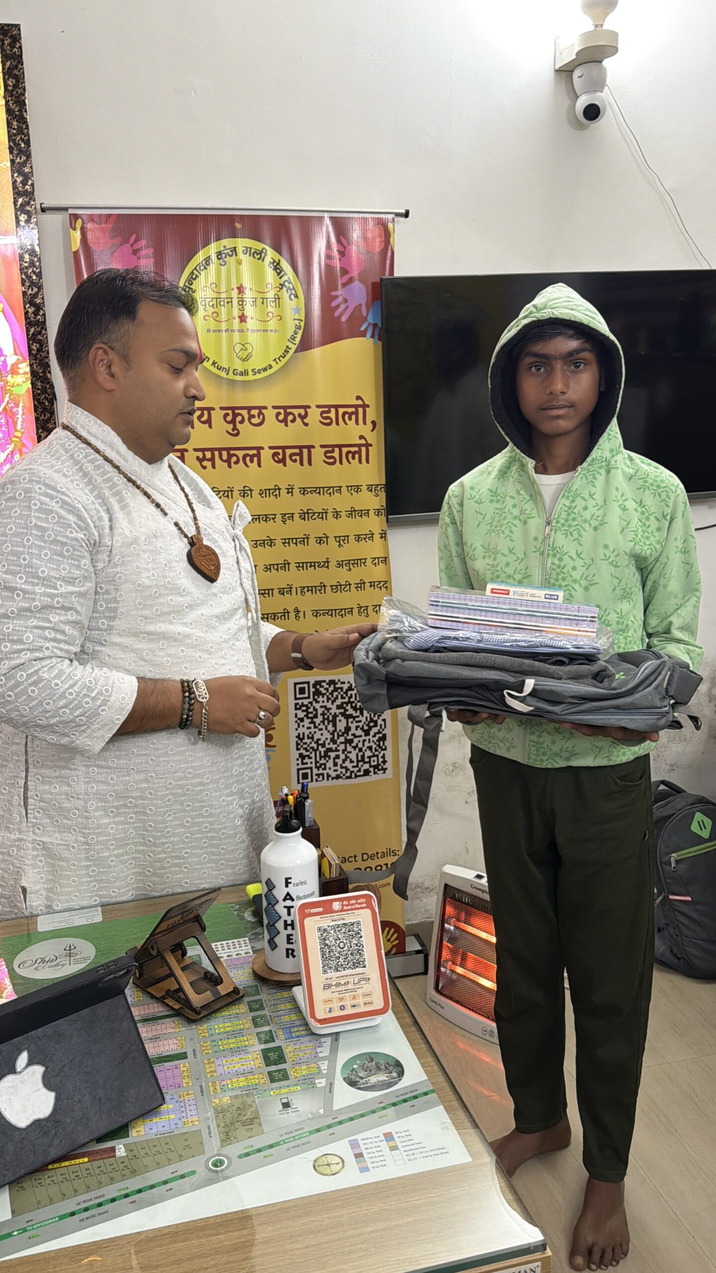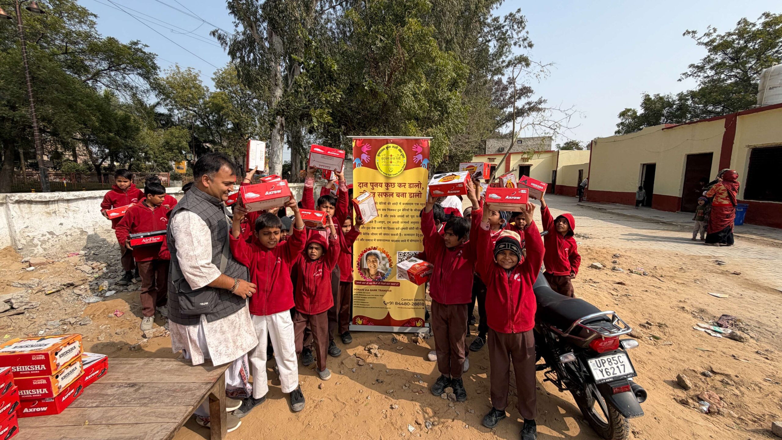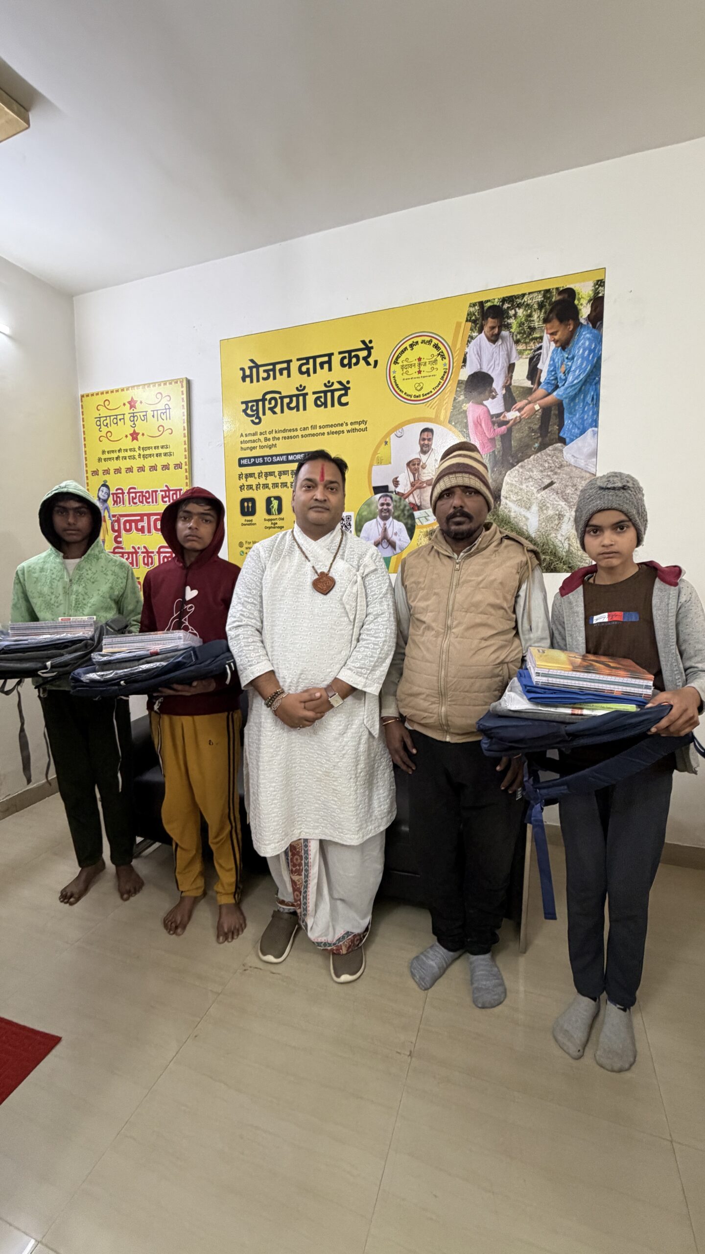 वृंदावन कुंज गली सेवा ट्रस्ट के माध्यम से उन्हें स्कूल बैग, सर्दियों की ड्रेस और पढ़ाई का आवश्यक सामान सप्रेम प्रदान किया गया 🙏।